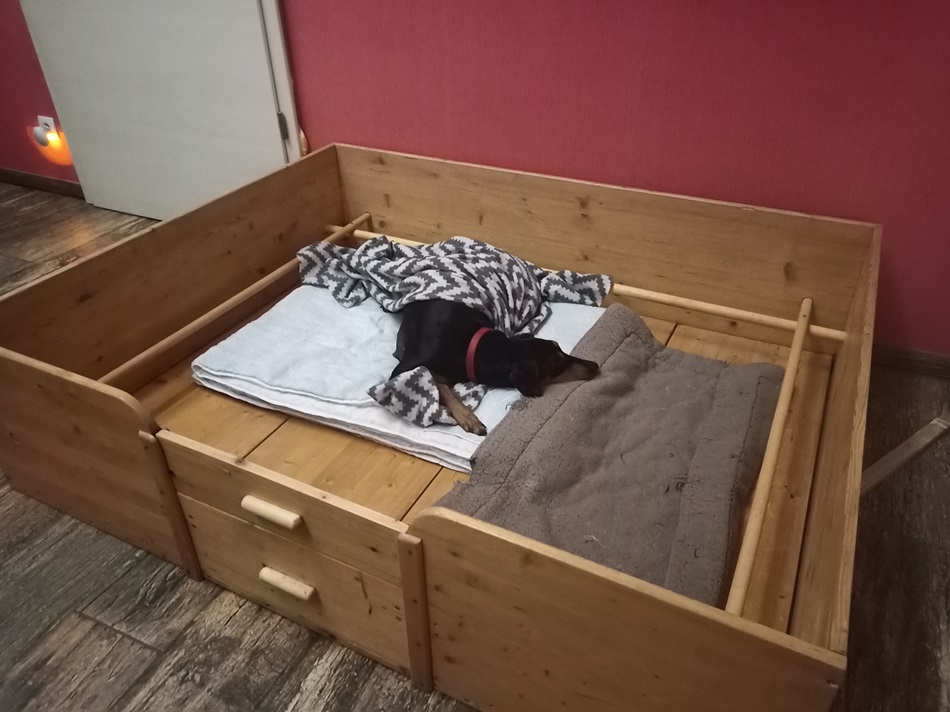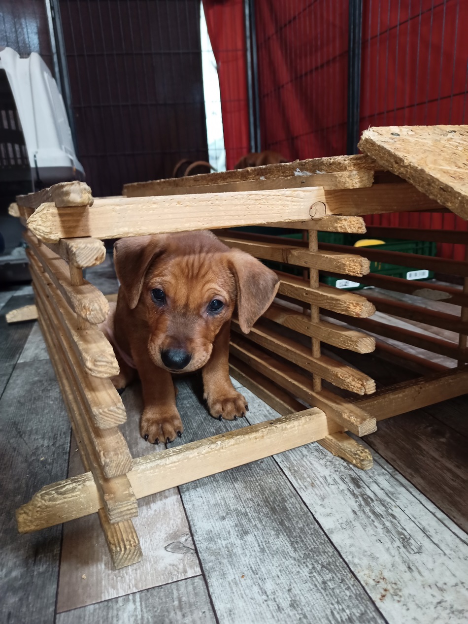 Eine gut ausgestattete Wurfkiste bietet den Welpen einen sicheren und warmen Ort für die ersten drei bis vier Wochen. Bei uns ist sie lang und breit genug, um auch einem großen Wurf Platz zum Bewegen zu bieten. Die Stangen am Rand schützen die Welpen in den ersten Tagen davor, von der sich legenden Mutter erdrückt zu werden. Mit etwa vier Wochen können die Welpen ihre Wurfkiste verlassen uns ziehen in den Auslauf im Wohnzimmer, um erste Erfahrungen mit der Umgebung zu sammeln. Dort lernen sie dann die anderen Hunde des Rudels kennen. Die Sozialisierung durch das Rudel führt zu einem gelassenen Umgang mit anderen Hunden.