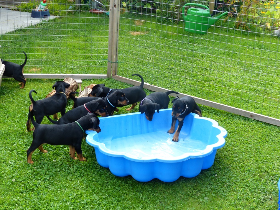 Die Erziehung zur Stubenreinheit erfordert Geduld und Konsequenz. Nach der Fütterung und zwischendurch lernen die Welpen, ihre Geschäfte draußen zu verrichten. Dafür gibt es einen Bereich auf der Terrasse und dem Rasen. Die Welpen verlassen nachts , um ihr Geschäft zu verrichten, ganz von alleine Ihren Schlafplatz im Körbchen. Im Auslauf im Haus legen wir eine große Fläche mit Papier aus. Diese Fläche reduzieren wir im Lauf der Wochen. Zu Abgabe wird die kleine Toilettenfläche kaum noch benutzt und die Welpen sind bald stubenrein.